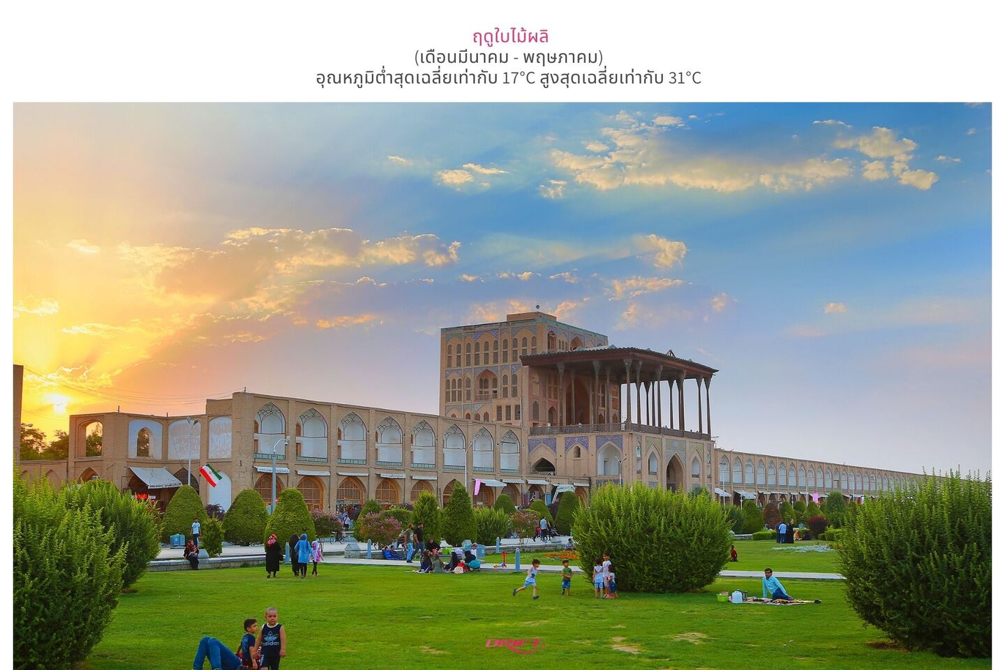 เสน่ห์ของฤดูใบไม้ผลิฤดูใบไม้ผลิ คือช่วงที่หลายคนยกให้เป็น "ฤดูที่ดีที่สุดในการเที่ยวอิหร่าน" เพราะอากาศกำลังดี๊ดี! อบอุ่น ไม่ร้อนจัด ไม่หนาวจนเกินไป ทุกอย่างเริ่มมีชีวิตชีวาอีกครั้งคุณจะได้เห็นสวนสวยๆ อย่างในรูปที่ Isfahan (อิสฟาฮาน) ที่หญ้าเขียวขจี ท้องฟ้าสดใส และเมฆเป็นปุย