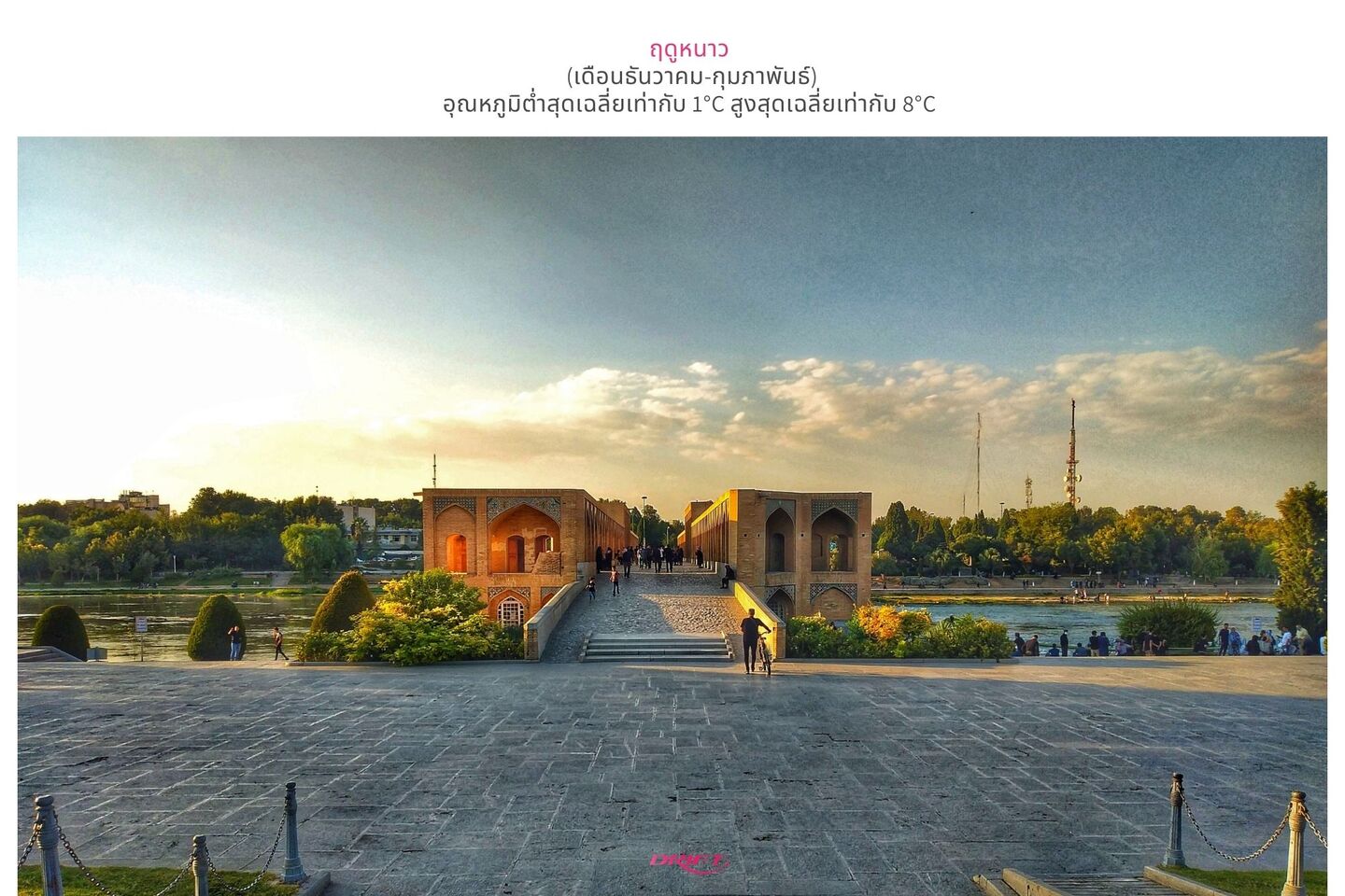 เสน่ห์ของฤดูหนาวสำหรับนักล่าความหนาวและคนไทยที่ใฝ่ฝันอยากเห็นหิมะ ฤดูหนาวในอิหร่าน คือคำตอบค่ะ! โดยเฉพาะในเมืองหลวงอย่างเตหะราน และเมืองทางเหนือที่มีเทือกเขา หิมะจะตกจริงจังมาก! คุณจะได้เห็นทิวทัศน์ภูเขาหิมะที่ตัดกับตึกรามบ้านช่องในเมือง เป็นภาพที่สวยงามและน่าประทับใจสุดๆลองนึกภาพการเดินชมสะพานสวยๆ อย่าง Khaju Bridge (สะพานคาจู) ในเมือง Isfahan (อิสฟาฮาน) หรือจัตุรัส Imam Square (อิหม่ามสแควร์) ท่ามกลางอากาศเย็นสบายๆ แทบไม่มีนักท่องเที่ยวพลุกพล่านเลย เป็นช่วงเวลาที่เหมาะกับการดื่มด่ำกับวัฒนธรรมอย่างแท้จริง